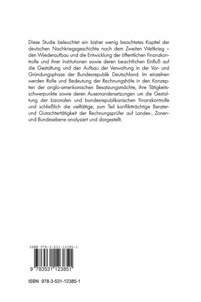 Bruchlose Kontinuität: Öffentliche Finanzkontrolle und anglo-amerikanische Besatzungspolitik.- I. Rechnungshöfe und amerikanische Besatzungspolitik.- II. Öffentliche Finanzkontrolle in der britischen Besatzungspolitik.- III. Der Rechnungshof des Deutschen Reichs (britische Zone).- Resümee.- Unitarismus versus Föderalismus: Die Gestaltung der öffentlichen Finanzkontrolle in der Vor- und Gründungsphase der Bundesrepublik.- Prolog.- I. Die Vorphase des bizonalen Rechnungsprüfungswesens: Konflikte und Kompromisse.- II. Die bizonale Rechnungsprüfung: Bündnisse und Blockaden.- III. Die Errichtung des Bundesrechnungshofes: Ein Konflikt schwelt weiter.- Epilog.- Wider den Wasserkopf von Hoechst: Die Prüfung der bizonalen Wirtschaftsverwaltung durch Kontrolleure des Rechnungshofes.- I. Die Vorgeschichte.- II. Das Gutachten der Haaser-Kommission.- III. Die Gutachtertätigkeit der Finanzkontrolleure im Spannungsfeld zwischen tradierter Verwaltungskontrolle und aktueller Verwaltungspolitik.- In der Kontinuität des Reichssparkommissars: Das Rechnungshof-Gutachten zur Neuordnung der Landesregierung und Landesverwaltung in Schleswig-Holstein.- I. Die politischen Rahmenbedingungen in Schleswig-Holstein nach dem Zusammenbruch des NS-Regimes.- II. Auftrag, Intention und Folgen des Gutachtens.- Politikberatung oder Politikgestaltung? Die verwaltungsreformerischen Intentionen der Finanzkontrolleure beim Aufbau der obersten Exekutivorgane der Bundesrepublik.- I. Die Berater- und Gutachtertätigkeit beim Parlamentarischen Rat.- II. Die Berater- und Gutachtertätigkeit im Organisationsausschuß der Ministerpräsidentenkonferenz.- Resümee: Verwaltete Politik oder politische Verwaltung?.- Epiprolog: Intermediäre Institutionen in pluralistisch verfaßten Gesellschaften.- I.Gesellschaftliche Pluralisierung und intermediäre Gewalten.- II. Öffentliche Finanzkontrolle: Ein blinder Fleck in der Finanzsoziologie.- III. Strukturparameter intermediärer Institutionen.- IV. Intermediäre Institutionen und gesellschaftliche Stabilität.- Abkürzungen.- Archive und Quellen.- Literatur.
