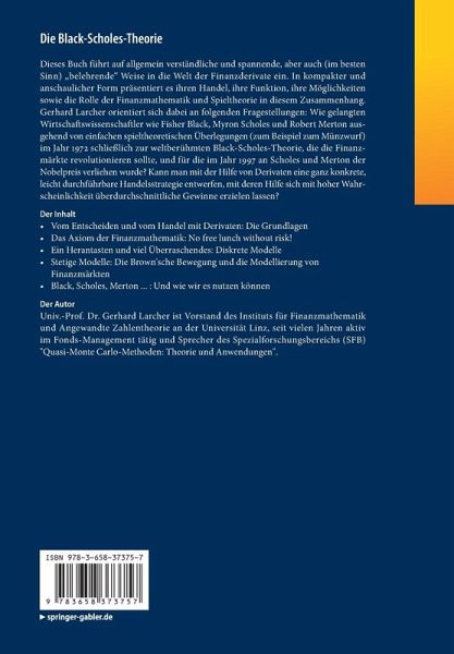 Dieses Buch führt auf allgemein verständliche und spannende, aber auch (im besten Sinn) "belehrende" Weise in die Welt der Finanzderivate ein. In kompakter und anschaulicher Form präsentiert es ihren Handel, ihre Funktion, ihre Möglichkeiten sowie die Rolle der Finanzmathematik und Spieltheorie in diesem Zusammenhang. Gerhard Larcher orientiert sich dabei an folgenden Fragestellungen: Wie gelangten Wirtschaftswissenschaftler wie Fisher Black, Myron Scholes und Robert Merton ausgehend von einfachen spieltheoretischen Überlegungen (zum Beispiel zum Münzwurf) im Jahr 1972 schließlich zur weltberühmten Black-Scholes-Theorie, die die Finanzmärkte revolutionieren sollte, und für die im Jahr 1997 an Scholes und Merton der Nobelpreis verliehen wurde? Kann man mit der Hilfe von Derivaten eine ganz konkrete, leicht durchführbare Handelsstrategie entwerfen, mit deren Hilfe sich mit hoher Wahrscheinlichkeit überdurchschnittliche Gewinne erzielen lassen?