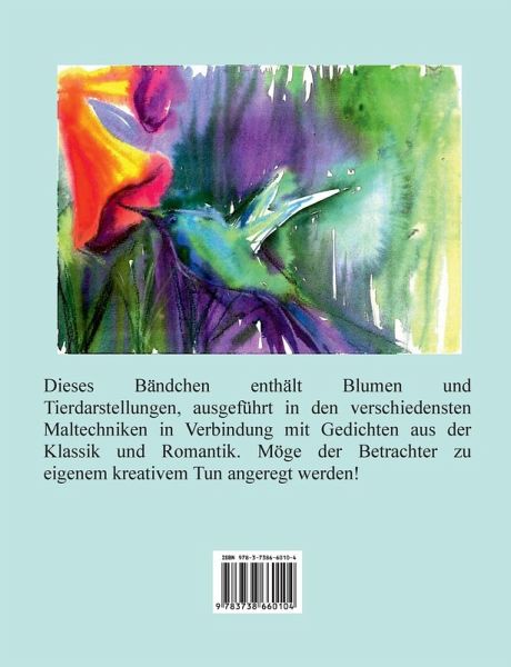 Dieses Bändchen enthält Blumen und Tierdarstellungen, ausgeführt in den verschiedensten Maltechniken in Verbindung mit Gedichten aus der Klassik und Romantik. Möge der Betrachter zu eigenem kreativem Tun angeregt werden!