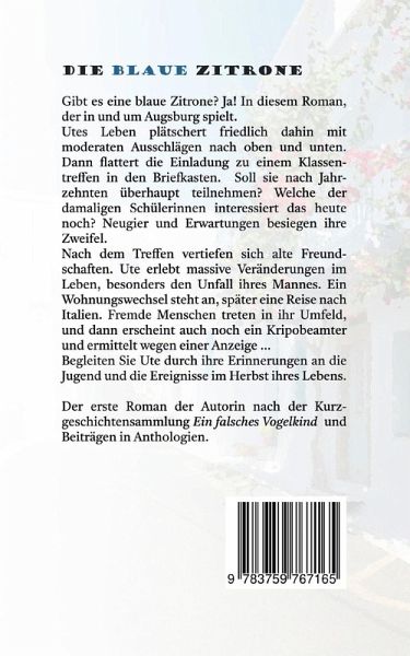 Die Blaue Zitrone Gibt es eine blaue Zitrone? Ja! In diesem Roman, der in und um Augsburg spielt. Utes Leben plätschert friedlich dahin mit moderaten Ausschlägen nach oben und unten. Dann flattert die Einladung zu einem Klassentreffen in den Briefkasten. Soll sie nach Jahrzehnten überhaupt teilnehmen? Welche der damaligen Schülerinnen interessiert das heute noch? Neugier und Erwartungen besiegen ihre Zweifel. Nach dem Treffen vertiefen sich alte Freundschaften. Ute erlebt massive Veränderungen im Leben, besonders den Unfall ihres Mannes. Ein Wohnungswechsel steht an, später eine Reise nach Italien. Fremde Menschen treten in ihr Umfeld, und dann erscheint auch noch ein Kripobeamter und ermittelt wegen einer Anzeige. Begleiten Sie Ute durch ihre Erinnerungen an die Jugend und die Ereignisse im Herbst ihres Lebens. Der erste Roman der Autorin nach der Kurzgeschichtensammlung Ein falsches Vogelkind und Beiträgen in Anthologien.