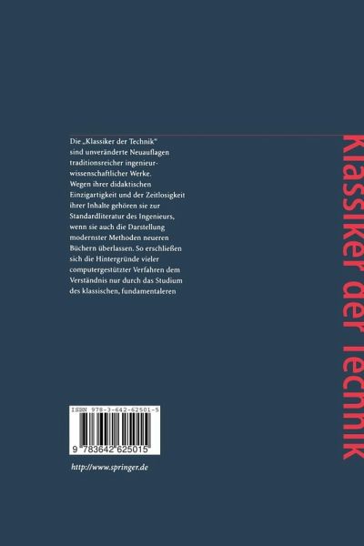 Die "Klassiker der Technik" sind unveränderte Neuauflagen traditionsreicher ingenieurwissenschaftlicher Werke. Wegen ihrer didaktischen Einzigartigkeit und der Zeitlosigkeit ihrer Inhalte gehören sie zur Standardliteratur des Ingenieurs, wenn sie auch die Darstellung modernster Methoden neueren Büchern überlassen. So erschließen sich die Hintergründe vieler computergestützter Verfahren dem Verständnis nur durch das Studium des klassischen, fundamentaleren Wissens. Oft bietet ein "Klassiker" einen Fundus an wichtigen Berechnungs- oder Konstruktionsbeispielen, die auch für viele moderne Problemstellungen als Musterlösungen dienen können.