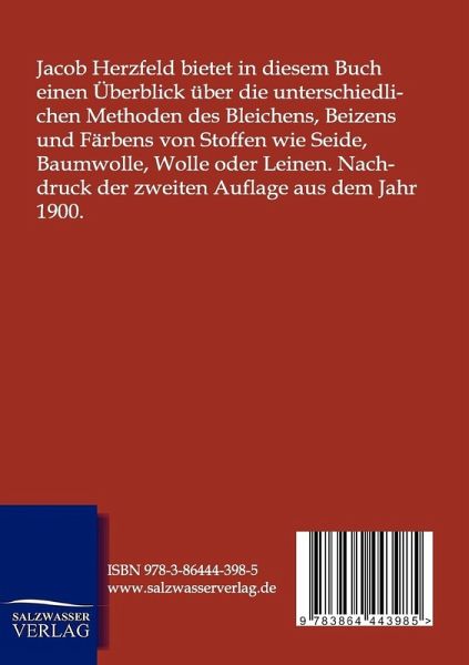 Jacob Herzfeld bietet in diesem Buch einen Überblick über die unterschiedlichen Methoden des Bleichens, Beizens und Färbens von Stoffen wie Seide, Baumwolle, Wolle oder Leinen. Nachdruck der zweiten Auflage aus dem Jahr 1900.