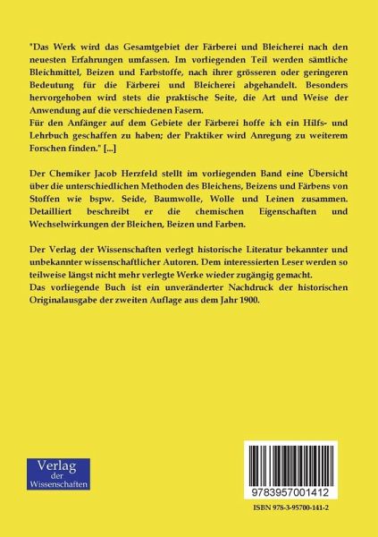 "Das Werk wird das Gesamtgebiet der Färberei und Bleicherei nach den neuesten Erfahrungen umfassen. Im vorliegenden Teil werden sämtliche Bleichmittel, Beizen und Farbstoffe, nach ihrer grösseren oder geringeren Bedeutung für die Färberei und Bleicherei abgehandelt. Besonders hervorgehoben wird stets die praktische Seite, die Art und Weise der Anwendung auf die verschiedenen Fasern.