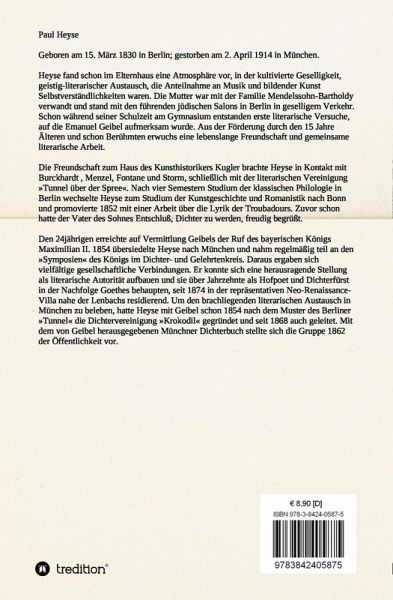 Paul Heyse (1830-1919), der Inbegriff des deutschsprachigen Dichters, war seit seinem 24. Lebensjahr Poeta laureatus am Hof Maximilians II. Mit seinen Novellen erlangte er in den siebziger Jahren des 19. Jahrhunderts große Berühmtheit. Sie wurden insbesondere für ihre 'vornehme Einfachheit', die sie unverkennbar machen, geschätzt. Später geriet er - und mit ihm sein Werk - ins Kreuzfeuer der Kritik. Von den Naturalisten wurde er wegen seiner bislang unangefochtenen Stellung als Vorzeigedichter angefeindet, andere verurteilten seine Novellen als zu unmoralisch. 1910 erhielt Paul Heyse für sein dichterisches Werk den Nobelpreis für Literatur.