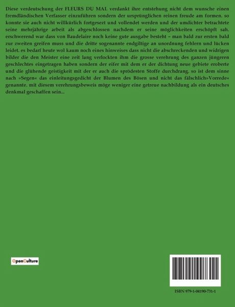 Diese verdeutschung der FLEURS DU MAL verdankt ihre entstehung nicht dem wunsche einen fremdländischen Verfasser einzuführen sondern der ursprünglichen reinen freude am formen. so konnte sie auch nicht willkürlich fortgesezt und vollendet werden und der umdichter betrachtete seine mehrjährige arbeit als abgeschlossen nachdem er seine möglichkeiten erschöpft sah. erschwerend war dass von Baudelaire noch keine gute ausgabe besteht ¿ man bald zur ersten bald zur zweiten greifen muss und die dritte sogenannte endgiltige an unordnung fehlern und lücken leidet. es bedarf heute wol kaum noch eines hinweises dass nicht die abschreckenden und widrigen bilder die den Meister eine zeit lang verlockten ihm die grosse verehrung des ganzen jüngeren geschlechtes eingetragen haben sondern der eifer mit dem er der dichtung neue gebiete eroberte und die glühende geistigkeit mit der er auch die sprödesten Stoffe durchdrang. so ist dem sinne nach »Segen« das einleitungsgedicht der Blumen des Bösen und nicht das fälschlich»Vorrede« genannte. mit diesem verehrungsbeweis möge weniger eine getreue nachbildung als ein deutsches denkmal geschaffen sein...