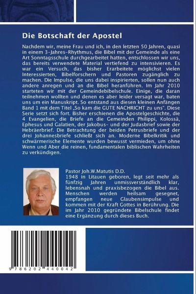 Nachdem wir, meine Frau und ich, in den letzten 50 Jahren, quasi in einem 3-Jahres-Rhythmus, die Bibel mit der Gemeinde als eine Art Sonntagsschule durchgearbeitet hatten, entschlossen wir uns, das bereits verwendete Material vertiefend zu intensivieren. Es war ein Versuch, das bisher Erarbeitete möglichst vielen Interessierten, Bibelforschern und Pastoren zugänglich zu machen. Die Impulse, die uns dabei inspirierten, sollen nun auch andere anregen und an die Bibel heranführen. Im Jahr 2010 starteten wir mit der Gemeindebibelschule. Einige, die daran teilnehmen wollten und denen es aber leider versagt war, baten uns um ein Manuskript. So entstand aus diesen kleinen Anfängen Band 1 mit dem Titel "So kam die GUTE NACHRICHT zu uns". Diese Serie setzt sich fort. Bisher erschienen die Apostelgeschichte, die 4 Evangelien, die Briefe an die Gemeinden Philippi, Kolossä, Ephesus und Galatien, der Jakobus- und der Judasbrief sowie der Hebräerbrief. Die Betrachtung der beiden Petrusbriefe und der drei Johannesbriefe schließt sich an. Moderne Bibelkritik und schwärmerische Elemente wurden bewusst vermieden, um ohne Wenn und Aber die reinen, fundamentalen biblischen Wahrheiten zu verkündigen.