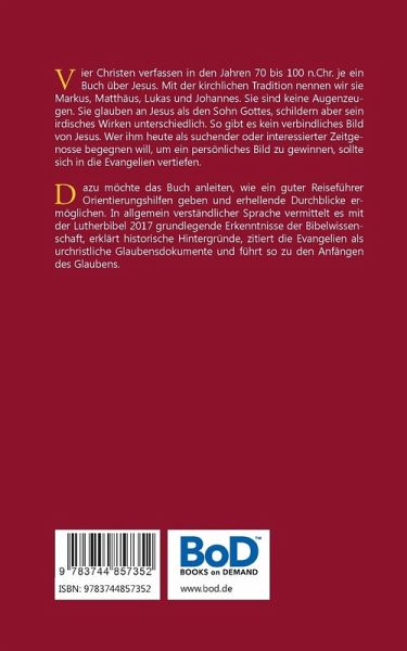 Vier Christusgläubige schreiben in den Jahren 70 bis 100 n.Chr. je ein Buch über Jesus. Mit der kirchlichen Tradition nennen wir sie Markus, Matthäus, Lukas und Johannes. Sie sind keine Augenzeugen. Sie glauben an Jesus als den Sohn Gottes, schildern aber sein irdisches Wirken unterschiedlich. So gibt es kein verbindliches Bild von Jesus. Wer ihm heute als suchender oder interessierter Zeitgenosse begegnen will, um ein persönliches Bild zu gewinnen, sollte sich in die Evangelien vertiefen. Dazu möchte das Buch anleiten, wie ein guter Reiseführer Orientierungshilfen geben und erhellende Durchblicke ermöglichen. In allgemein verständlicher Sprache vermittelt es mit der Lutherbibel 2017 grundlegende Erkenntnisse der Bibelwissenschaft, erklärt historische Hintergründe, zitiert die Evangelien als urchristliche Glaubensdokumente und führt so zu den Anfängen des Glaubens.