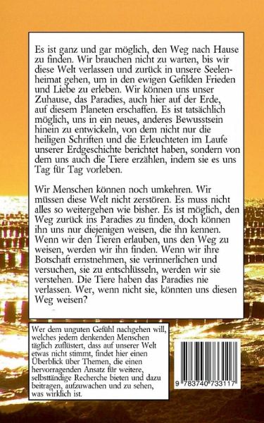 Wer dem unguten Gefühl nachgehen will, welches jedem denkenden Menschen täglich zuflüstert, das auf unserer Welt etwas nicht stimmt, findet hier einen Überblick über Themen, die einen hervorragenden Ansatz für weitere, selbstständige Recherche bieten und dazu beitragen, aufzuwachen und zu sehen, was wirklich ist.Es ist ganz und gar möglich, den Weg nach Hause zu finden. Wir brauchen nicht zu warten, bis wir diese Welt verlassen und zurück in unsere Seelenheimat gehen, um in den ewigen Gefilden Frieden und Liebe zu erleben. Wir können uns unser Zuhause, das Paradies, auch hier auf der Erde, auf diesem Planeten erschaffen. Es ist tatsächlich möglich, uns in ein neues, anderes Bewusstsein hinein zu entwickeln, von dem nicht nur die heiligen Schriften und die Erleuchteten im Laufe unserer Erdgeschichte berichtet haben, sondern von dem uns auch die Tiere erzählen, indem sie es uns Tag für Tag vorleben.Wir Menschen können noch umkehren. Wir müssen diese Welt nicht zerstören. Es muss nicht alles so weitergehen wie bisher. Es ist möglich, den Weg zurück ins Paradies zu finden, doch können ihn uns nur diejenigen weisen, die ihn kennen.Wenn wir den Tieren erlauben, uns den Weg zu weisen, werden wir ihn finden. Wenn wir ihre Botschaft ernstnehmen, sie verinnerlichen und versuchen, sie zu entschlüsseln, werden wir sie verstehen. Die Tiere haben das Paradies nie verlassen. Wer, wenn nicht sie, könnten uns diesen Weg weisen?