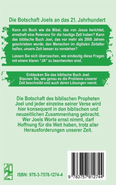 Die Botschaft Joels an das 21. Jahrhundert.Warum das biblische Buch Joel für unsere Zeit geschrieben wurde.Kann ein Buch wie die Bibel, das von Jesus berichtet, ernsthaft eine Relevanz für die heutige Zeit haben? Kann das biblische Buch Joel, das vor mehr als 2000 Jahren geschrieben wurde, den Menschen im digitalen Zeitalter helfen, unsere Zeit besser zu verstehen?Lassen Sie sich überraschen, wie eindeutig diese Fragen mit einem klaren JA zu beantworten sind. Entdecken Sie das biblische Buch Joel. Staunen Sie, wie genau es die Probleme unserer Zeit beschreibt und auch deren Lösungen nennt.Die Botschaft des biblischen Propheten Joel und jeder einzelne seiner Verse wird hier konsequent in den biblischen und neuzeitlichen Zusammenhang gebracht. Wer Joels Worte ernst nimmt, darf Hoffnung für die Welt haben, trotz aller Herausforderungen unserer Zeit.
