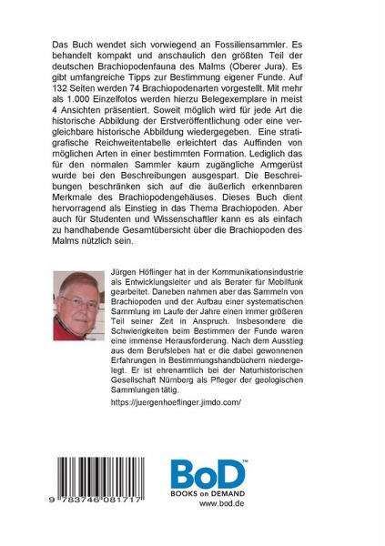 Das Buch wendet sich vorwiegend an Fossiliensammler. Es behandelt kompakt und anschaulich den größten Teil der deutschen Brachiopodenfauna des Malms (Oberer Jura). Es gibt umfangreiche Tipps zur Bestimmung eigener Funde. Auf 132 Seiten werden 74 Brachiopodenarten vorgestellt. Mit mehr als 1.000 Einzelfotos werden hierzu Belegexemplare in meist 4 Ansichten präsentiert. Soweit möglich wird für jede Art die historische Abbildung der Erstveröffentlichung oder eine vergleichbare historische Abbildung wiedergegeben. Eine stratigrafische Reichweitentabelle erleichtert das Auffinden von möglichen Arten in einer bestimmten Formation. Lediglich das für den normalen Sammler kaum zugängliche Armgerüst wurde bei den Beschreibungen ausgespart. Die Beschrei-bungen beschränken sich auf die äußerlich erkennbaren Merkmale des Brachiopodengehäuses. Dieses Buch dient hervorragend als Einstieg in das Thema Brachiopoden. Aber auch für Studenten und Wissenschaftler kann es als einfach zu handhabende Gesamtübersicht über die Brachiopoden des Malms nützlich sein.