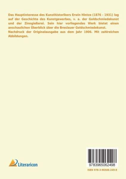 Das Hauptinteresse des Kunsthistorikers Erwin Hintze (1876 - 1931) lag auf der Geschichte des Kunstgewerbes, v. a. der Goldschmiedekunst und der Zinngießerei. Sein hier vorliegendes Werk bietet einen anschaulichen Überblick über die Breslauer Goldschmiedekunst.