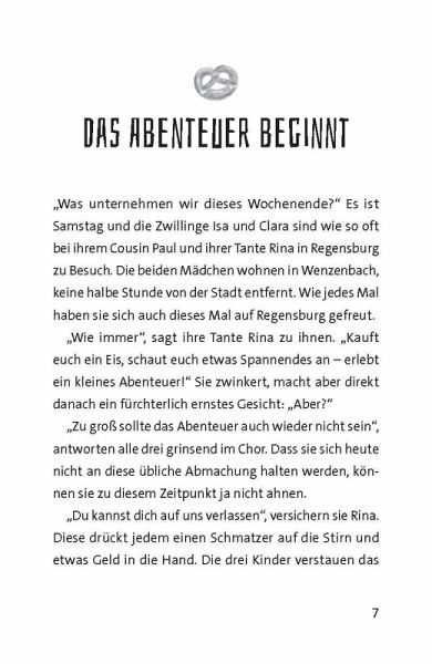 Eigentlich wollen Isa, Clara und Paul nur einen gemütlichen Samstag in Regensburg verbringen. Doch plötzlich geraten sie in einen spektakulären Kriminalfall: Der Regensburger Domschatz wurde gestohlen! Die ganze Stadt ist im Ausnahmezustand ...Eine gefährliche Verfolgungsjagd beginnt und führt die drei Kinder quer durch die Stadt und den Landkreis Regensburg. Dabei entdecken sie nicht nur zahlreiche Spuren, sondern ganz nebenbei auch die vielen Sehenswürdigkeiten der Region. Doch wird es ihnen auch gelingen, ihren ersten Fall zu lösen?