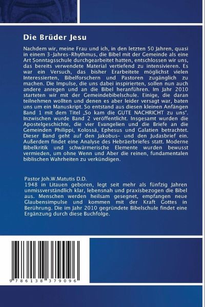 Nachdem wir, meine Frau und ich, in den letzten 50 Jahren, quasi in einem 3-Jahres-Rhythmus, die Bibel mit der Gemeinde als eine Art Sonntagsschule durchgearbeitet hatten, entschlossen wir uns, das bereits verwendete Material vertiefend zu intensivieren. Es war ein Versuch, das bisher Erarbeitete möglichst vielen Interessierten, Bibelforschern und Pastoren zugänglich zu machen. Die Impulse, die uns dabei inspirierten, sollen nun auch andere anregen und an die Bibel heranführen. Im Jahr 2010 starteten wir mit der Gemeindebibelschule. Einige, die daran teilnehmen wollten und denen es aber leider versagt war, baten uns um ein Manuskript. So entstand aus diesen kleinen Anfängen Band 1 mit dem Titel "So kam die GUTE NACHRICHT zu uns". Inzwischen wurde Band 2 veröffentlicht. Insgesamt wurden die Apostelgeschichte, die vier Evangelien und die Briefe an die Gemeinden Philippi, Kolossä, Ephesus und Galatien betrachtet. Dieser Band geht auf den Jakobus- und den Judasbrief ein. Außerdem findet eine Analyse des Hebräerbriefes statt. Moderne Bibelkritik und schwärmerische Elemente wurden bewusst vermieden, um ohne Wenn und Aber die reinen, fundamentalen biblischen Wahrheiten zu verkündigen.