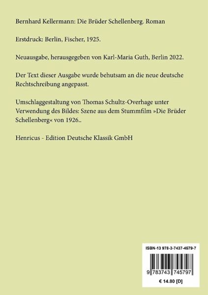 Bernhard Kellermann: Die Brüder Schellenberg. RomanErstdruck: Berlin, Fischer, 1925.Neuausgabe, herausgegeben von Karl-Maria Guth, Berlin 2023.Der Text dieser Ausgabe wurde behutsam an die neue deutsche Rechtschreibung angepasst.Umschlagabbildung: Szene aus dem Stummfilm »Die Brüder Schellenberg« von 1926.Gesetzt aus der Minion Pro, 11 pt.Die Sammlung Hofenberg erscheint im Verlag Henricus - Edition Deutsche Klassik GmbH, Berlin