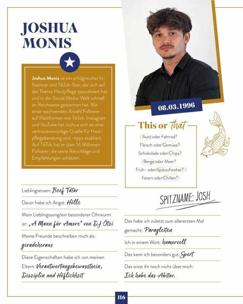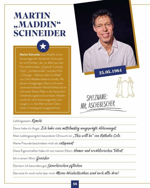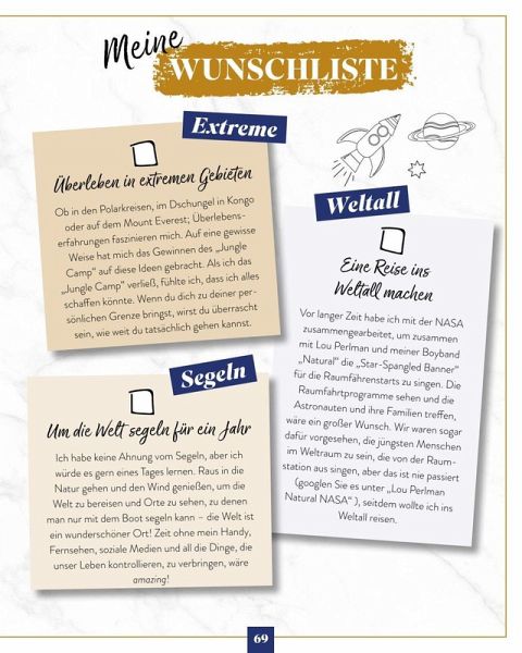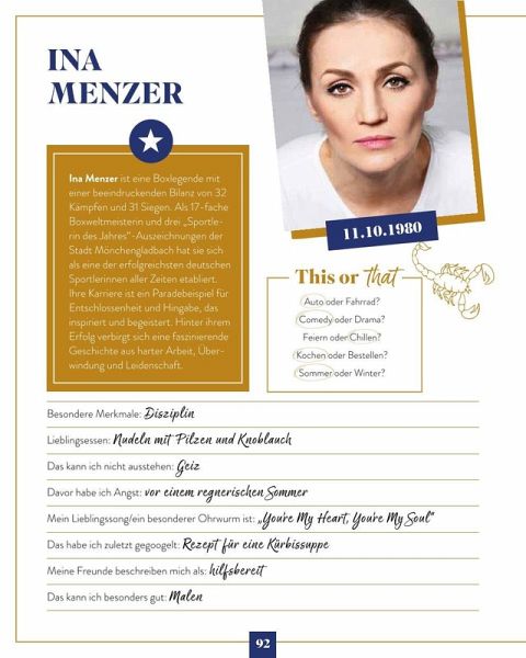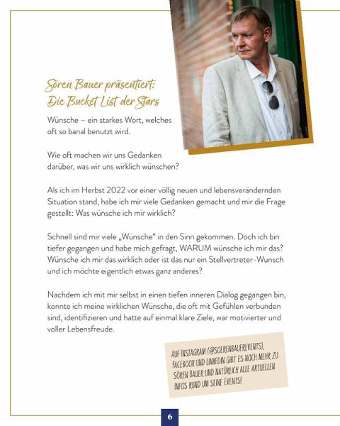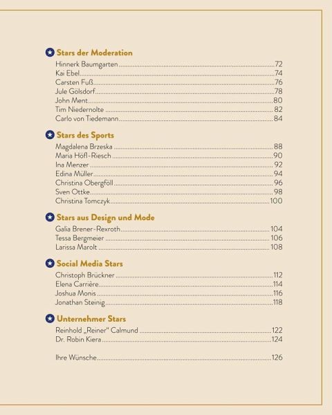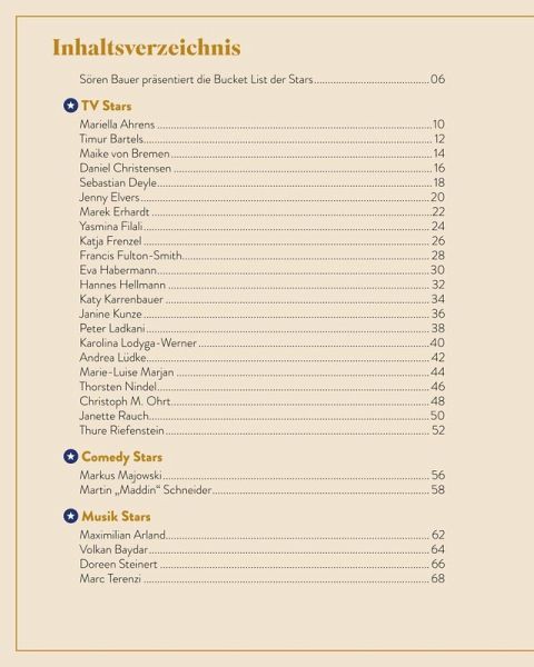 Was möchten Deutschlands Promis und Celebrities unbedingt erreichen? Wie sehen ihre Pläne aus? Wovon träumen sie heimlich? Ist es wie bei uns Normalsterblichen die Hochzeit mit der Liebe Ihres Lebens, eine Reise zum Lieblingsurlaubsort oder ein Traumhaus? Oder vielleicht doch etwas Luxuriöses und Actionreiches wie eine Übernachtung im Unterwasserhotel? Ein Besuch eines Lost Place, eine Pilgerreise oder eine Reise nur mit Rucksack, fernab vom Promi-Ruhm? Lesen Sie, welche lustigen, verrückten, aber auch ernsten und manchmal skurrilen Ideen auf den Bucket Lists der deutschen Stars und Promis stehen! Hier ist das Who is who der deutschen Celebrities versammelt! Eingerahmt von Star-Portraits öffnen Deutschlands Promis aus TV, Musik, Moderation, Comedy, Social Media und Sport die Türen und gewähren exklusive Einblicke in ihre intimsten und geheimsten Wünsche und Träume! Dazu gibt es von jedem Star natürlich noch ein supernettes, persönliches Foto - wie in einem echten Freunde-Steckbrief-Buch. Na, neugierig? Lesen Sie, wovon Reiner Calmund, Katy Karrenbauer, Janine Kunze, Joshua Monis & Co. heimlich träumen! Erfahren Sie hier, was sie persönlich bewegt, und kommen Sie den Celebrities ganz nah! Promis privat - 150 Dinge, die Sie immer schon über Deutschlands Celebrities wissen wollten! 50 Star-Porträts, Fotos und Steckbriefe - das perfekte Geschenk für alle, die Promi-News, heißen Gossip und die Welt der Stars lieben!Mariella Ahrens - Timur Bartels - Maike von Bremen - Daniel Christensen - Sebastian Deyle - Jenny Elvers - Marek Erhardt - Yasmina Filali - Katja Frenzel - Francis Fulton-Smith - Eva Habermann - Hannes Hellmann - Katy Karrenbauer - Janine Kunze - Peter Ladkani - Karolina Lodyga-Werner - Andrea Lüdke - Marie-Luise Marjan - Thorsten Nindel - Christoph M. Ohrt - Janette Rauch - Thure Riefenstein - Markus Majowski - Martin "Maddin" Schneider - Maximilian Arland - Volkan Baydar - Doreen Steinert - Marc Terenzi - Hinnerk Baumgarten - Kai Ebel - Carsten Fuß - Jule Gölsdorf - John Ment - Tim Niedernolte - Carlo von Tiedemann - Magdalena Brzeska - Maria Höfl-Riesch - Ina Menzer - Edina Müller -Christina Obergföll - Sven Ottke - Christina Tomczyk - Galia Brener-Rexroth - Tessa Bergmeier - Larissa Marolt - Christoph Brückner - Elena Carrière - Joshua Monis - Jonathan Steinig - Reinhold "Reiner" Calmund - Dr. Robin Kiera