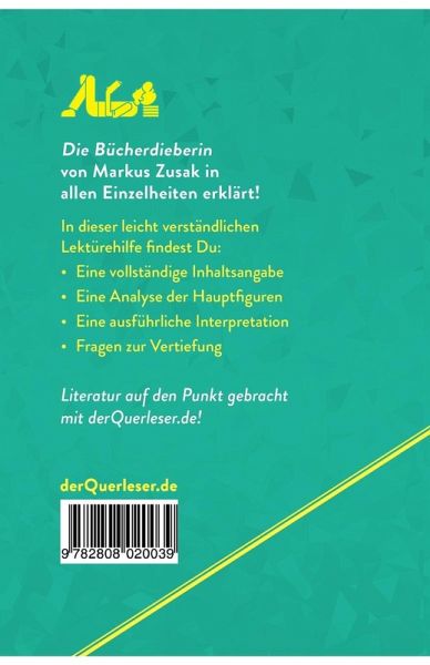 Die Bücherdiebin von Markus Zusak ¿ Endlich verständlich mit der Lektürehilfe von derQuerleser! Diese klare und zuverlässige Analyse von Markus Zusaks Die Bücherdiebin aus dem Jahre 2005 hilft Dir dabei, den Bestseller schnell in seinen wichtigsten Punkten zu erfassen. Aus der Sicht des Todes wird die Geschichte eines jungen Mädchens erzählt, das während des Zweiten Weltkriegs bei ihren Pflegeeltern die Liebe zu Büchern und die Macht der Worte entdeckt. In dieser Lektürehilfe sind enthalten: ¿ Eine vollständige Inhaltsangabe ¿ Eine übersichtliche Analyse der Hauptfiguren mit interessanten Details ¿ Eine leicht verständliche Interpretation der wesentlichen Themen ¿ Fragen zur Vertiefung Warum derQuerleser? Egal ob Du Literaturliebhaber mit wenig Zeit zum Lesen, Lesemuffel oder Schüler in der Prüfungsvorbereitung bist, die Analysereihe derQuerleser.de bietet Dir sofort zugängliches Wissen über literarische Werke ¿ ganz klassisch als Buch oder natürlich auf Deinem Computer, Tablet oder Smartphone! Viele unserer Lektürehilfen enthalten zudem Verweise auf Sekundärliteratur und Adaptionen, die die Übersicht sinnvoll ergänzen. Literatur auf den Punkt gebracht mit derQuerleser!