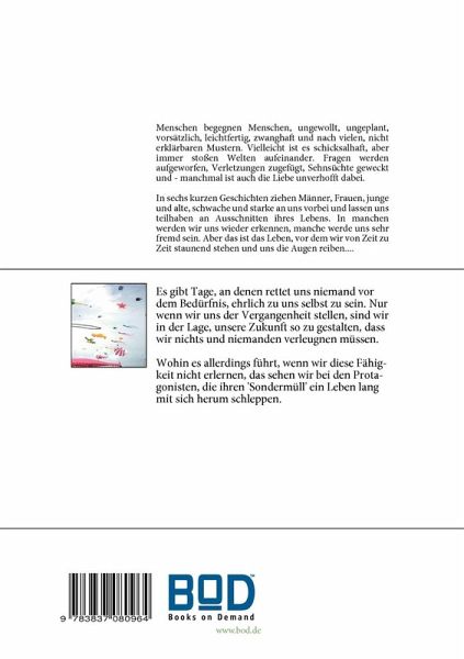 Menschen begegnen Menschen, ungewollt, ungeplant, vorsätzlich, leichtfertig, zwanghaft und nach vielen, nicht erklärbaren Mustern. Vielleicht ist es schicksalhaft, aber immer stoßen Welten aufeinander. Fragen werden aufgeworfen, Verletzungen zugefügt, Sehnsüchte geweckt und - manchmal ist auch die Liebe unverhofft dabei.In sechs kurzen Geschichten ziehen Männer, Frauen, junge und alte, schwache und starke an uns vorbei und lassen uns teilhaben an Ausschnitten ihres Lebens. In manchen werden wir uns wieder erkennen, manche werde uns sehr fremd sein. Aber das ist das Leben, vor dem wir von Zeit zu Zeit staunend stehen und uns die Augen reiben....