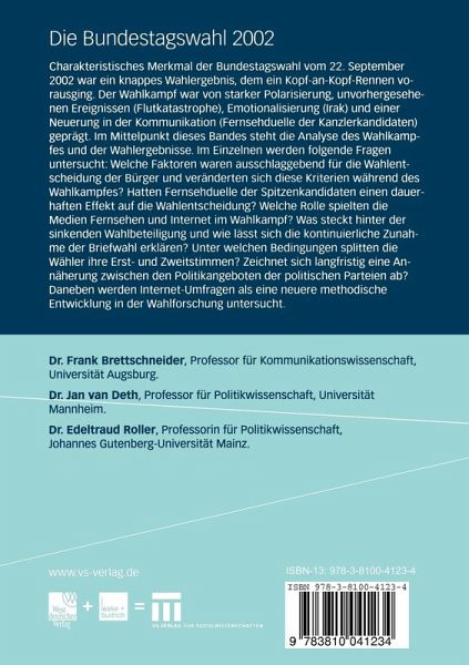 Charakteristisches Merkmal der Bundestagswahl vom 22. September 2002 war ein knappes Wahlergebnis, dem ein Kopf-an-Kopf-Rennen vorausging. Der Wahlkampf war von starker Polarisierung, unvorhergesehenen Ereignissen (Flutkatastrophe), Emotionalisierung (Irak) und einer Kritik an der Qualität und Professionalität der empirischen Wahlforschung geprägt. Im Mittelpunkt dieses Bandes steht die Analyse des Wahlkampfes und der Wahlergebnisse. Im Einzelnen werden folgende Fragen untersucht: Welche Faktoren waren ausschlaggebend für die Wahlentscheidung der Bürger und veränderten sich diese Kriterien während des Wahlkampfes? Hatten Fernsehduelle der Spitzenkandidaten einen dauerhaften Effekt auf die Wahlentscheidung? Welche Rolle spielten die Medien Fernsehen und Internet im Wahlkampf? Was steckt hinter der sinkenden Wahlbeteiligung und wie lässst sich die kontinuierliche Zunahme der Briefwahl erklären? Unter welchen Bedingungen splitten die Wähler ihre Erst- und Zweitstimmen? Zeichnet sichlangfristig eine Annäherung zwischen den Politikangeboten der politischen Parteien ab? Daneben werden neuere methodische Entwicklungen in der Wahlforschung wie Internet-Umfragen und Wahlwetten untersucht.