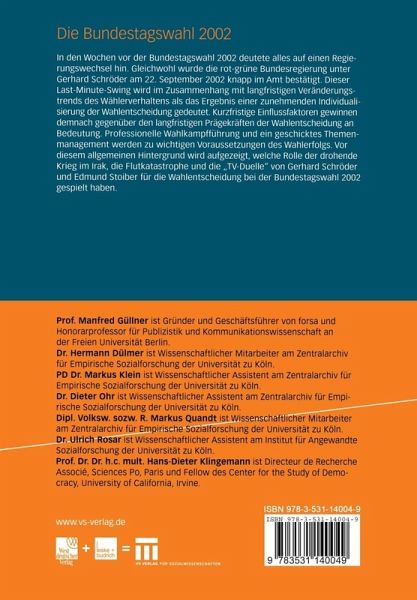 In den Wochen vor der Bundestagswahl 2002 deutete alles auf einen Regierungswechsel hin. Gleichwohl wurde die rot-grüne Bundesregierung unter Gerhard Schröder am 22. September 2002 knapp im Amt bestätigt. Dieser Last-Minute-Swing wird im Zusammenhang mit langfristigen Veränderungstrends des Wählerverhaltens als das Ergebnis einer zunehmenden Individualisierung der Wahlentscheidung gedeutet. Kurzfristige Einflussfaktoren gewinnen demnach gegenüber den langfristigen Prägekräften der Wahlentscheidung an Bedeutung. Professionelle Wahlkampfführung und ein geschicktes Themenmanagement werden zu wichtigen Voraussetzungen des Wahlerfolgs. Vor diesem allgemeinen Hintergrund wird aufgezeigt, welche Rolle der drohende Krieg im Irak, die Flutkatastrophe und die "TV-Duelle" von Gerhard Schröder und Edmund Stoiber für die Wahlentscheidung bei der Bundestagswahl 2002 gespielt haben. Die empirischen Analysen stützen sich auf ein breites Spektrum von Umfragen, die vom Berliner Meinungsforschungsinstitut forsa im Vorfeld der Bundestagswahl erhoben wurden. Eine wichtige Rolle spielt dabei das forsa OmniNet, bei dem die Befragung internetgestützt über den heimischen Fernsehbildschirm erfolgt. Dieses neuartige Befragungsinstrument wird im Anhang des Buches detailliert beschrieben.