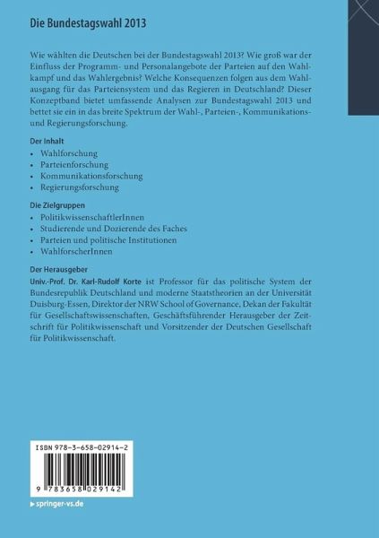 Wie wählten die Deutschen bei der Bundestagswahl 2013? Wie groß war der Einfluss der Programm- und Personalangebote der Parteien auf den Wahlkampf und das Wahlergebnis? Welche Konsequenzen folgen aus dem Wahlausgang für das Parteiensystem und das Regieren in Deutschland? Dieser Konzeptband bietet umfassende Analysen zur Bundestagswahl 2013 und bettet sie ein in das breite Spektrum der Wahl-, Parteien-, Kommunikations- und Regierungsforschung.