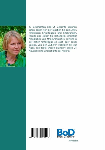 13 Geschichten und 25 Gedichte spannen einen Bogen von der Kindheit bis zum Alter, reflektieren Erwartungen und Erfahrungen, Freude und Trauer. Sie behandeln scheinbar Alltägliches und Ungewöhnliches, sowohl in der nahen Umgebung als auch quer durch Europa, von den Äußeren Hebriden bis zur Ägäis. Die Texte werden illustriert durch 21 Aquarelle und Linolschnitte der Autorin.