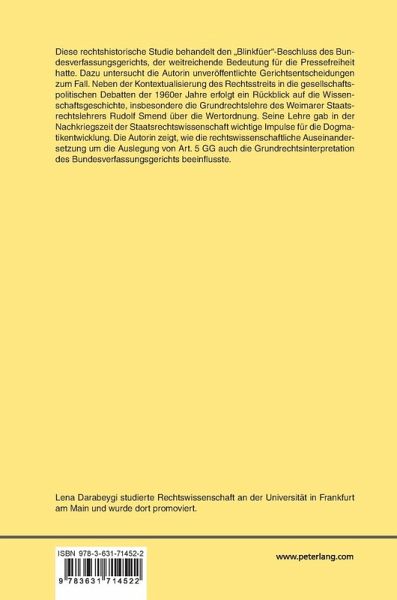 Diese rechtshistorische Studie behandelt den «Blinkfüer»-Beschluss des Bundesverfassungsgerichts, der weitreichende Bedeutung für die Pressefreiheit hatte. Dazu untersucht die Autorin unveröffentlichte Gerichtsentscheidungen zum Fall. Neben der Kontextualisierung des Rechtsstreits in die gesellschaftspolitischen Debatten der 1960er Jahre erfolgt ein Rückblick auf die Wissenschaftsgeschichte, insbesondere die Grundrechtslehre des Weimarer Staatsrechtslehrers Rudolf Smend über die Wertordnung. Seine Lehre gab in der Nachkriegszeit der Staatsrechtswissenschaft wichtige Impulse für die Dogmatikentwicklung. Die Autorin zeigt, wie die rechtswissenschaftliche Auseinandersetzung um die Auslegung von Art. 5 GG auch die Grundrechtsinterpretation des Bundesverfassungsgerichts beeinflusste.