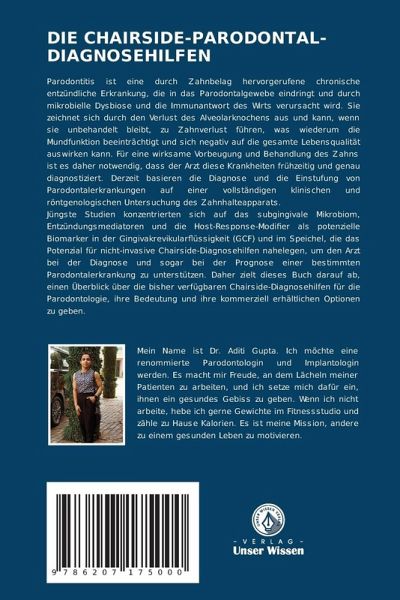 Parodontitis ist eine durch Zahnbelag hervorgerufene chronische entzündliche Erkrankung, die in das Parodontalgewebe eindringt und durch mikrobielle Dysbiose und die Immunantwort des Wirts verursacht wird. Sie zeichnet sich durch den Verlust des Alveolarknochens aus und kann, wenn sie unbehandelt bleibt, zu Zahnverlust führen, was wiederum die Mundfunktion beeinträchtigt und sich negativ auf die gesamte Lebensqualität auswirken kann. Für eine wirksame Vorbeugung und Behandlung des Zahns ist es daher notwendig, dass der Arzt diese Krankheiten frühzeitig und genau diagnostiziert. Derzeit basieren die Diagnose und die Einstufung von Parodontalerkrankungen auf einer vollständigen klinischen und röntgenologischen Untersuchung des Zahnhalteapparats.Jüngste Studien konzentrierten sich auf das subgingivale Mikrobiom, Entzündungsmediatoren und die Host-Response-Modifier als potenzielle Biomarker in der Gingivakrevikularflüssigkeit (GCF) und im Speichel, die das Potenzial für nicht-invasive Chairside-Diagnosehilfen nahelegen, um den Arzt bei der Diagnose und sogar bei der Prognose einer bestimmten Parodontalerkrankung zu unterstützen. Daher zielt dieses Buch darauf ab, einen Überblick über die bisher verfügbaren Chairside-Diagnosehilfen für die Parodontologie, ihre Bedeutung und ihre kommerziell erhältlichen Optionen zu geben.