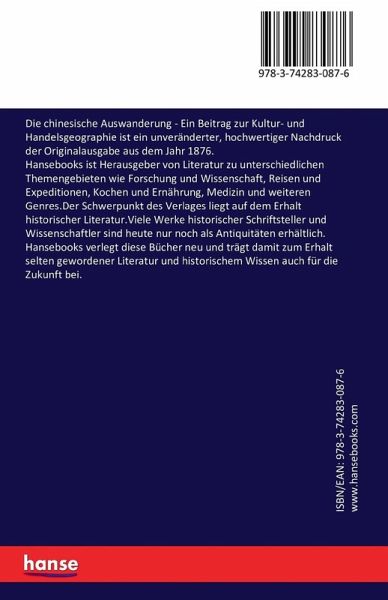 Die chinesische Auswanderung - Ein Beitrag zur Kultur- und Handelsgeographie ist ein unveränderter, hochwertiger Nachdruck der Originalausgabe aus dem Jahr 1876.