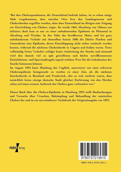 Dieses Buch über die Cholera-Epidemie in Hamburg 1892 stellt Beobachtungen und Versuche über Ursachen, Bekämpfung und Behandlung der asiatischen Cholera dar und ist ein unveränderter Nachdruck der Originalausgabe von 1893.
