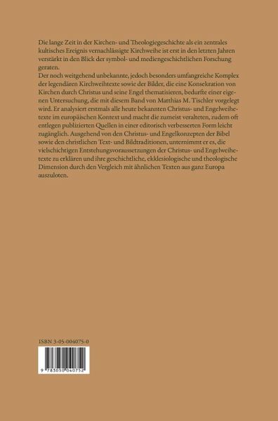 Die lange Zeit in der Kirchen- und Theologiegeschichte als ein zentrales kultisches Ereignis vernachlässigte Kirchweihe ist erst in den letzten Jahren verstärkt in den Blick der symbol- und mediengeschichtlichen Forschung geraten. Der noch weitgehend unbekannte, jedoch besonders umfangreiche Komplex der legendären Kirchweihtexte sowie der Bilder, die eine Konsekration von Kirchen durch Christus und seine Engel thematisieren, bedurfte einer eigenen Untersuchung, die mit diesem Band von Matthias M. Tischler vorgelegt wird. Er analysiert erstmals alle heute bekannten Christus- und Engelweihetexte im europäischen Kontext und macht die zumeist veralteten, zudem oft entlegen publizierten Quellen in einer editorisch verbesserten Form leicht zugänglich. Ausgehend von den Christus- und Engelkonzepten der Bibel sowie den christlichen Text- und Bildtraditionen, unternimmt er es, die vielschichtigen Entstehungsvoraussetzungen der Christus- und Engelweihetexte zu erklären und ihre geschichtliche, ekklesiologische und theologische Dimension durch den Vergleich mit ähnlichen Texten aus ganz Europa auszuloten.