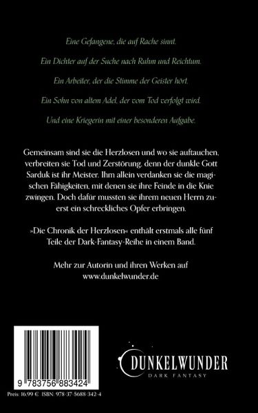 FÜNF SCHICKSALE. EINE BESTIMMUNG.Eine Gefangene, die auf Rache sinnt.Ein Dichter auf der Suche nach Ruhm und Reichtum. Ein Arbeiter, der die Stimme der Geister hört. Ein Sohn von altem Adel, der vom Tod verfolgt wird.Eine Kriegerin mit einer besonderen Aufgabe.Gemeinsam sind sie die Herzlosen und wo sie auftauchen, verbreiten sich Tod und Zerstörung. Denn der dunkle Gott Sarduk ist ihr Meister. Ihm allein verdanken sie die magischen Fähigkeiten, mit denen sie ihre Feinde in die Knie zwingen. Doch dafür mussten sie ihrem neuen Herrn zuerst ein schreckliches Opfer erbringen.»Die Chronik der Herzlosen« umfasst erstmals alle Kurzromane sowie Kurzgeschichten der Reihe in einem Band.