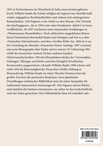 Wilhelm Raabe: Die Chronik der Sperlingsgasse Lesefreundlicher Großdruck in 16-pt-Schrift Großformat, 210 x 297 mm Berliner Ausgabe, 2020 Durchgesehener Neusatz mit einer Biographie des Autors bearbeitet und eingerichtet von Theodor Borken Entstanden 1854/55. Erstdruck: Berlin (Stage) 1857 (pseudonym). Textgrundlage ist die Ausgabe: Wilhelm Raabe: Ausgewählte Werke in sechs Bänden. Herausgegeben von Peter Goldammer und Helmut Richter, Berlin und Weimar: Aufbau, 1964¿1966. Umschlaggestaltung von Thomas Schultz-Overhage unter Verwendung des Bildes: Spreestraße, heute Sperlingsgasse, in Berlin, Fotografie um 1885. Gesetzt aus der Minion Pro, 16 pt. Henricus Edition Deutsche Klassik UG (haftungsbeschränkt) Über den Autor: 1831 in Eschershausen im Weserland als Sohn eines Juristen geboren, bricht Wilhelm Raabe die Schule erfolglos ab, beginnt eine ebenfalls bald wieder aufgegebene Buchhändlerlehre und widmet sich umfangreicher Romanlektüre. 1854 beginnt er die Arbeit an dem Roman »Die Chronik der Sperlingsgasse«, die er 1856 unter dem Pseudonym »Jakob Corvinus« veröffentlicht. Ab 1857 erscheinen seine historischen Erzählungen in »Westermanns Monatsheften«. Nach zahlreichen ausgedehnten Reisen durch Deutschland übersiedelt Raabe nach Stuttgart und tritt u.a. dem »Deutschen Nationalverein« und dem »Großen Klub« bei. 1866 ist er an der Gründung der liberalen »Deutschen Partei« beteiligt. 1897 erscheint eine erste Monographie über Raabe und zu seinem 70. Geburtstag 1901 erhält der inzwischen verehrte Dichter mehrere hundert Glückwunschschreiben. Mit den Ehrendoktorwürden der Universitäten Göttingen, Tübingen und Berlin und dem Königlich Preußischen Kronenorden ausgezeichnet, erkrankt Wilhelm Raabe 1909 schwer und stirbt 1910 als Ehrenmitglied der Deutschen Schiller-Stiftung in Braunschweig. Wilhelm Raabe ist neben Theodor Fontane einer der großen Vertreter des poetischen Realismus. Seine plastischen Darstellungen realistischer Bildlichkeit sind mit seiner Sympathie für Außenseiter humoristisch stimmungsvoll. »Die Figuren meiner Bücher sind sämtlich der Fantasie entnommen; nur selten ist das Landschaftliche nach der Natur gezeichnet. Das Volkstümliche fasse ich instinktiv auf.«