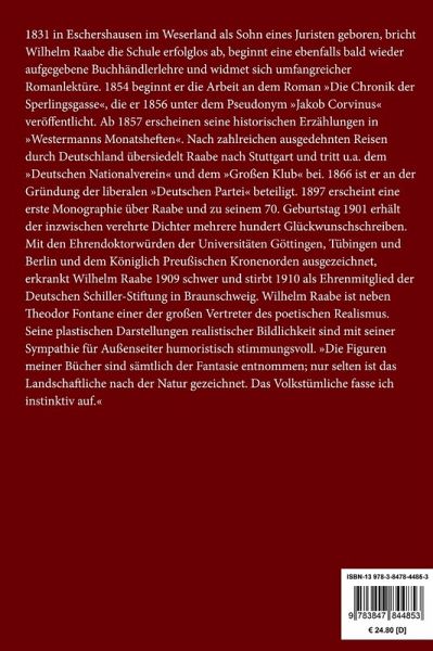 Wilhelm Raabe: Die Chronik der Sperlingsgasse Lesefreundlicher Großdruck in 16-pt-Schrift Großformat, 210 x 297 mm Berliner Ausgabe, 2020 Durchgesehener Neusatz mit einer Biographie des Autors bearbeitet und eingerichtet von Theodor Borken Entstanden 1854/55. Erstdruck: Berlin (Stage) 1857 (pseudonym). Textgrundlage ist die Ausgabe: Wilhelm Raabe: Ausgewählte Werke in sechs Bänden. Herausgegeben von Peter Goldammer und Helmut Richter, Berlin und Weimar: Aufbau, 1964¿1966. Umschlaggestaltung von Thomas Schultz-Overhage unter Verwendung des Bildes: Spreestraße, heute Sperlingsgasse, in Berlin, Fotografie um 1885. Gesetzt aus der Minion Pro, 16 pt. Über den Autor: 1831 in Eschershausen im Weserland als Sohn eines Juristen geboren, bricht Wilhelm Raabe die Schule erfolglos ab, beginnt eine ebenfalls bald wieder aufgegebene Buchhändlerlehre und widmet sich umfangreicher Romanlektüre. 1854 beginnt er die Arbeit an dem Roman »Die Chronik der Sperlingsgasse«, die er 1856 unter dem Pseudonym »Jakob Corvinus« veröffentlicht. Ab 1857 erscheinen seine historischen Erzählungen in »Westermanns Monatsheften«. Nach zahlreichen ausgedehnten Reisen durch Deutschland übersiedelt Raabe nach Stuttgart und tritt u.a. dem »Deutschen Nationalverein« und dem »Großen Klub« bei. 1866 ist er an der Gründung der liberalen »Deutschen Partei« beteiligt. 1897 erscheint eine erste Monographie über Raabe und zu seinem 70. Geburtstag 1901 erhält der inzwischen verehrte Dichter mehrere hundert Glückwunschschreiben. Mit den Ehrendoktorwürden der Universitäten Göttingen, Tübingen und Berlin und dem Königlich Preußischen Kronenorden ausgezeichnet, erkrankt Wilhelm Raabe 1909 schwer und stirbt 1910 als Ehrenmitglied der Deutschen Schiller-Stiftung in Braunschweig. Wilhelm Raabe ist neben Theodor Fontane einer der großen Vertreter des poetischen Realismus. Seine plastischen Darstellungen realistischer Bildlichkeit sind mit seiner Sympathie für Außenseiter humoristisch stimmungsvoll. »Die Figuren meiner Bücher sind sämtlich der Fantasie entnommen; nur selten ist das Landschaftliche nach der Natur gezeichnet. Das Volkstümliche fasse ich instinktiv auf.«