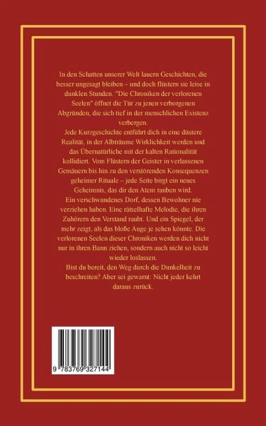 In den Schatten unserer Welt lauern Geschichten, die besser ungesagt bleiben - und doch flüstern sie leise in dunklen Stunden. "Die Chroniken der verlorenen Seelen" öffnet die Tür zu jenen verborgenen Abgründen, die sich tief in der menschlichen Existenz verbergen. Jede Kurzgeschichte entführt dich in eine düstere Realität, in der Alpträume Wirklichkeit werden und das Übernatürliche mit der kalten Rationalität kollidiert. Vom Flüstern der Geister in verlassenen Gemäuern bis hin zu den verstörenden Konsequenzen geheimer Rituale - jede Seite birgt ein neues Geheimnis, das dir den Atem rauben wird. Ein verschwundenes Dorf, dessen Bewohner nie verziehen haben. Eine rätselhafte Melodie, die ihren Zuhörern den Verstand raubt. Und ein Spiegel, der mehr zeigt, als das bloße Auge je sehen könnte. Die verlorenen Seelen dieser Chroniken werden dich nicht nur in ihren Bann ziehen, sondern auch nicht so leicht wieder loslassen. Bist du bereit, den Weg durch die Dunkelheit zu beschreiten? Aber sei gewarnt: Nicht jeder kehrt daraus zurück.