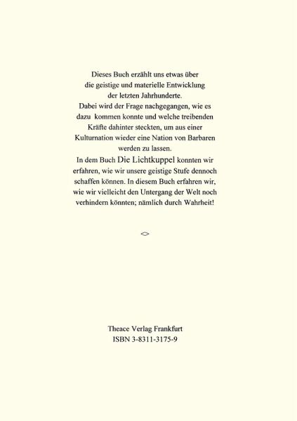 Dieses Buch erzählt uns etwas über die geistige und materielle Entwicklung der letzten Jahrhunderte. Dabei wird der Frage nachgegangen, wie es dazu kommen konnte und welche treibenden Kräfte dahinter steckten, um aus einer Kulturnation wieder eine Nation von Barbaren werden zu lassen. In dem Buch "Die Lichtkuppel" konnten wir erfahren, wie wir unsere geistige Stufe dennoch schaffen können. In diesem Buch erfahren wir, wie wir vielleicht den Untergang der Welt noch verhindern könnten; nämlich durch Wahrheit!