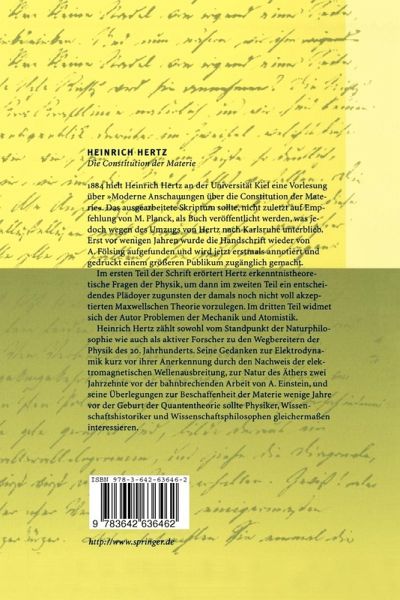 1884 hielt Heinrich Hertz an der Universität Kiel eine Vorlesung über "Moderne Anschauungen über die Constitution der Materie". Das ausgearbeitete Manuskript sollte als Buch veröffentlicht werden, was jedoch unterblieb. Das Manuskript wurde von A. Fölsing kürzlich aufgefunden. Hertz erörtert zunächst erkenntnistheoretische Fragen der Physik, der zweite Teil ist ein entschiedenes Plädoyer zugunsten der Maxwellschen Theorie, und im dritten Teil werden Probleme der Mechanik und Atomistik behandelt.
