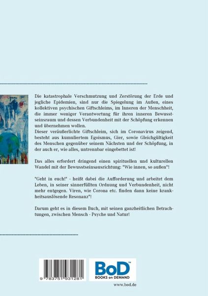 Die katastrophale Verschmutzung und Zerstörung der Erde und jegliche Epidemien sind nur die Spiegelung im Außen eines kollektiven psychischen Giftschleims im Inneren der Menschheit, die immer weniger Verantwortung für ihren inneren Bewusstseinsraum und dessen Verbundenheit mit der Schöpfung erkennen und übernehmen wollen. Dieser veräußerlichte Giftschleim - als Spiegel, im Coronavirus, sich zeigend, besteht aus kumuliertem Egoismus, Gier, sowie Gleichgültigkeit des Menschen gegenüber seinem Nächsten und de Schöpfung, in der auch er, wie alles, untrennbar eingebettet ist! Das alles erfordert dringend einen spirituellen und kulturellen Wandel mit der Bewusstseinsausrichtung: Wie innen, so außen! Wenn der Mensch sich so mehr und mehr als als Göttliches Ebenbild erkennen und empfinden kann, dann ändert sich auch seine Welt, hin zu ihrer Fülle, mit weiteren Horizonten und Viren, wie Corona, finden hier keine krankheitsauslösende Resonanz!Darum geht es in diesem Buch mit seinen ganzheitlich -psychologischen Betrachtungen nach C.G.Jung und dem Hermetischen Weltbild!