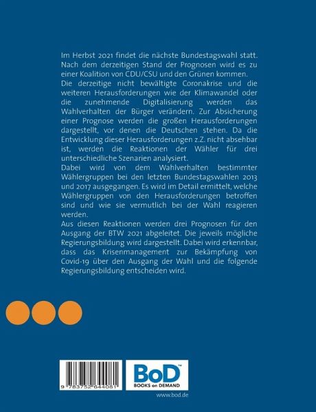 Im Herbst 2021 findet die nächste Bundestagswahl statt. Nach dem derzeitigen Stand der Prognosen wird es zu einer Koalition von CDU/CSU und den Grünen kommen. Die derzeitige nicht bewältigte Coronakrise und die weiteren Herausforderungen wie der Klimawandel oder die zunehmende Digitalisierung werden das Wahlverhalten der Bürger verändern. Zur Absicherung einer Prognose werden die großen Herausforderungen dargestellt, vor denen die Deutschen stehen. Da die Entwicklung dieser Herausforderungen z.Z. nicht absehbar ist, werden die Reaktionen der Wähler für drei unterschiedliche Szenarien analysiert. Dabei wird von dem Wahlverhalten bestimmter Wählergruppen bei den letzten Bundestagswahlen 2013 und 2017 ausgegangen. Es wird im Detail ermittelt, welche Wählergruppen von den Herausforderungen betroffen sind und wie sie vermutlich bei der Wahl reagieren werden. Aus diesen Reaktionen werden drei Prognosen für den Ausgang der BTW 2021 abgeleitet. Die jeweils mögliche Regierungsbildung wirddargestellt. Dabei wird erkennbar, dass das Krisenmanagement zur Bekämpfung von Covid-19 über den Ausgang der Wahl und die folgende Regierungsbildung entscheiden wird.