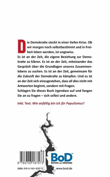 Die Demokratie steckt in einer tiefen Krise. Sie befindet sich in dramatischen Rückzugsgefechten mit ungewissem Ausgang. Überall sind Polarisierungen zu beobachten und tiefe gesellschaftliche Risse tun sich auf. Populisten sind allerorten auf dem Vormarsch und besetzen zunehmend die Herzkammern der Demokratie.Werden wir morgen noch selbstbestimmt und in Freiheit leben können? Wie wird es mit der Demokratie weitergehen? Wie sieht ihre Zukunft aus? Hat Sie überhaupt eine? Und was bedeutet das alles für mich? Wie soll ich mich positionieren, mit all dem umgehen? Der Psychologe und Krisenmanager Dr. Stefan Junker hilft dem Leser auf verblüffende Weise bei der Klärung dieser drängenden Fragen: Er stellt seinerseits Fragen. Hunderte. Ein ganzes Buch voller frecher, nachdenklich machender, intellektuell herausfordernder, manchmal auch einfach unterhaltsamer Fragen. Fragen, die zur Selbstreflexion und zu spannenden, lustvollen Gesprächen mit Mitmenschen anregen. Fragen, die zu neuen, lohnenden Begegnungen mit dem eigenen Ich und anderen führen.Stefan Junker ist überzeugt: Es wird höchste Zeit, die eigene Beziehung zur Demokratie zu klären. Er macht Mut, politisch zu denken und zu handeln. Er zeigt mit seinen Fragen, dass jeder etwas tun kann, um die Zukunft der gesellschaftlichen Verhältnisse aktiv mitzugestalten."Die Demokratie und Du. Zukunft fraglich." - ein außergewöhnliches Buch voller Fragen, das dem Leser hilft eigene Antworten auf die Herausforderungen der Gegenwart zu finden.Schlagen Sie dieses Buch irgendwo auf und fangen Sie an zu fragen - sich selbst und andere. Inklusive Test: Wie anfällig bin ich für Populismus?