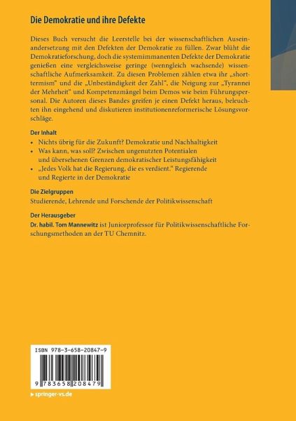 Dieses Buch versucht die Leerstelle bei der wissenschaftlichen Auseinandersetzung mit den Defekten der Demokratie zu füllen. Zwar blüht die Demokratieforschung, doch die systemimmanenten Defekte der Demokratie genießen eine vergleichsweise geringe (wenngleich wachsende) wissenschaftliche Aufmerksamkeit. Zu diesen Problemen zählen etwa ihr "short-termism" und die "Unbeständigkeit der Zahl", die Neigung zur "Tyrannei der Mehrheit" und Kompetenzmängel beim Demos wie beim Führungspersonal. Die Autoren dieses Bandes - renommierte Experten auf dem Gebiet der Demokratieforschung - greifen je einen Defekt heraus, beleuchten ihn eingehend und diskutieren institutionenreformerische Lösungsvorschläge.