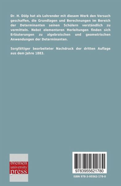 Dr. H. Dölp hat als Lehrender mit diesem Werk den Versuch geschaffen, die Grundlagen und Berechnungen im Bereich der Determinanten seinen Schülern verständlich zu vermitteln. Nebst elementaren Herleitungen finden sich Erläuterungen zu algebraischen und geometrischen Anwendungen der Determinanten. Sorgfältiger bearbeiteter Nachdruck der dritten Auflage aus dem Jahre 1883.
