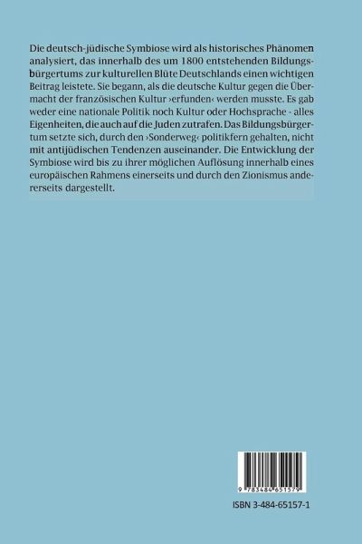 This study analyses the German-Jewish symbiosis as a historical phenomenon that made a significant contribution to Germany's cultural flowering in connection with the emergence of an educated middle-class (Bildungsbürgertum) around 1800. It began when German culture had to be 'invented' in order to free itself from the supremacy of French culture. In political, cultural, and linguistic terms Germany had nothing that could truly be called 'national', and precisely the same applied to the Jews as well. The educated middle-classes were kept remote from political life by the German Sonderweg and did not engage with anti-Jewish tendencies. The study discusses the development of this symbiosis up to its dissolution in a European framework, on the one hand, and as a result of Zionism on the other.