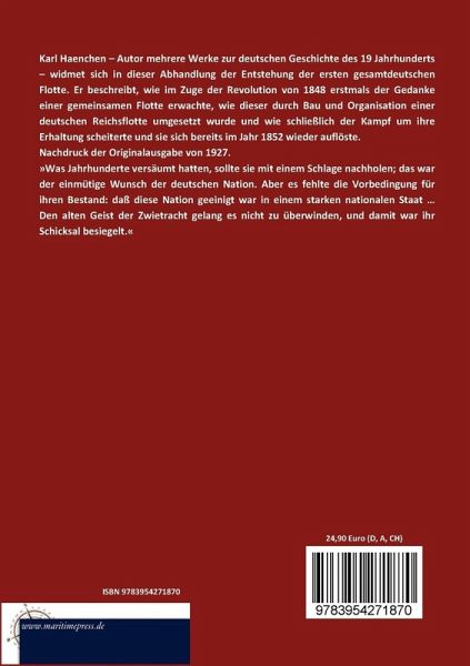 Karl Haenchen Autor mehrere Werke zur deutschen Geschichte des 19 Jahrhunderts widmet sich in dieser Abhandlung der Entstehung der ersten gesamtdeutschen Flotte. Er beschreibt, wie im Zuge der Revolution von 1848 erstmals der Gedanke einer gemeinsamen Flotte erwachte, wie dieser durch Bau und Organisation einer deutschen Reichsflotte umgesetzt wurde und wie schließlich der Kampf um ihre Erhaltung scheiterte und sie sich bereits im Jahr 1852 wieder auflöste.