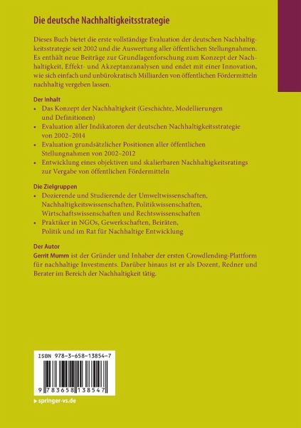Dieses Buch bietet die erste vollständige Evaluation der deutschen Nachhaltigkeitsstrategie seit 2002 und die Auswertung aller öffentlichen Stellungnahmen. Es enthält neue Beiträge zur Grundlagenforschung zum Konzept der Nachhaltigkeit, Effekt- und Akzeptanzanalysen und endet mit einer Innovation, wie sich einfach und unbürokratisch Milliarden von öffentliche Fördermittel nachhaltig vergeben lassen.
