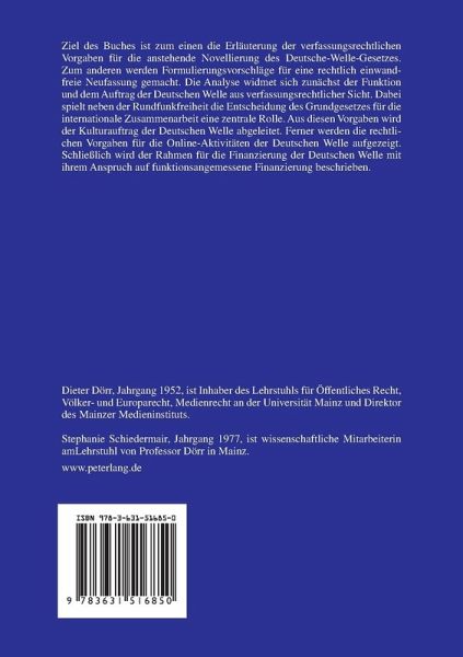 Ziel des Buches ist zum einen die Erläuterung der verfassungsrechtlichen Vorgaben für die anstehende Novellierung des Deutsche-Welle-Gesetzes. Zum anderen werden Formulierungsvorschläge für eine rechtlich einwandfreie Neufassung gemacht. Die Analyse widmet sich zunächst der Funktion und dem Auftrag der Deutschen Welle aus verfassungsrechtlicher Sicht. Dabei spielt neben der Rundfunkfreiheit die Entscheidung des Grundgesetzes für die internationale Zusammenarbeit eine zentrale Rolle. Aus diesen Vorgaben wird der Kulturauftrag der Deutschen Welle abgeleitet. Ferner werden die rechtlichen Vorgaben für die Online-Aktivitäten der Deutschen Welle aufgezeigt. Schließlich wird der Rahmen für die Finanzierung der Deutschen Welle mit ihrem Anspruch auf funktionsangemessene Finanzierung beschrieben.