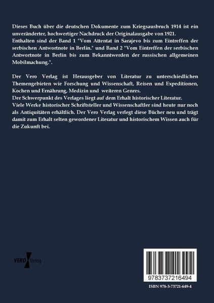 Enthalten sind der Band 1 "Vom Attentat in Sarajevo bis zum Eintreffen der serbischen Antwortnote in Berlin." und Band 2 "Vom Eintreffen der serbischen Antwortnote in Berlin bis zum Bekanntwerden der russischen allgemeinen Mobilmachung.".