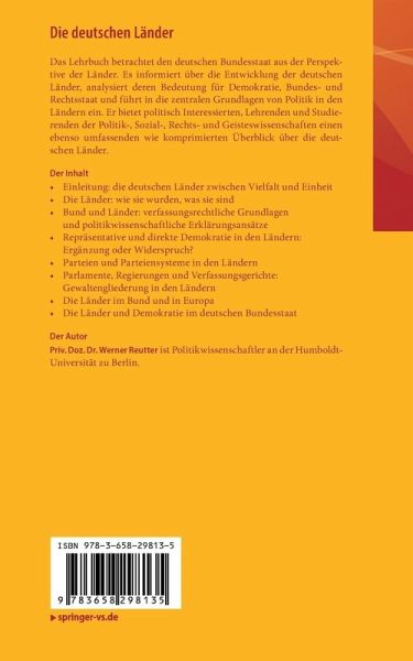 Das Lehrbuch betrachtet den deutschen Bundesstaat aus der Perspektive der Länder. Es informiert über die Entwicklung der deutschen Länder, analysiert deren Bedeutung für Demokratie, Bundes- und Rechtsstaat und führt in die zentralen Grundlagen von Politik in den Ländern ein. Er bietet politisch Interessierten, Lehrenden und Studierenden der Politik-, Sozial-, Rechts- und Geisteswissenschaften einen ebenso umfassenden wie komprimierten Überblick über die deutschen Länder.
