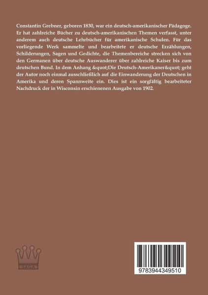 Constantin Grebner, geboren 1830, war ein deutsch-amerikanischer Pädagoge. Er hat zahlreiche Bücher zu deutsch-amerikanischen Themen verfasst, unter anderem auch deutsche Lehrbücher für amerikanische Schulen. Für das vorliegende Werk sammelte und bearbeitete er deutsche Erzählungen, Schilderungen, Sagen und Gedichte, die Themenbereiche strecken sich von den Germanen über deutsche Auswanderer über zahlreiche Kaiser bis zum deutschen Bund. In dem Anhang "Die Deutsch-Amerikaner" geht der Autor noch einmal ausschließlich auf die Einwanderung der Deutschen in Amerika und deren Spannweite ein. Dies ist ein sorgfältig bearbeiteter Nachdruck der in Wisconsin erschienenen Ausgabe von 1902.
