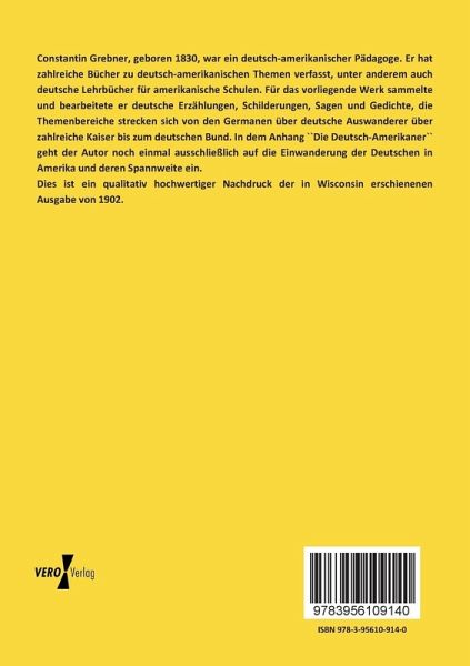 Constantin Grebner, geboren 1830, war ein deutsch-amerikanischer Pädagoge. Er hat zahlreiche Bücher zu deutsch-amerikanischen Themen verfasst, unter anderem auch deutsche Lehrbücher für amerikanische Schulen. Für das vorliegende Werk sammelte und bearbeitete er deutsche Erzählungen, Schilderungen, Sagen und Gedichte, die Themenbereiche strecken sich von den Germanen über deutsche Auswanderer über zahlreiche Kaiser bis zum deutschen Bund. In dem Anhang ``Die Deutsch-Amerikaner`` geht der Autor noch einmal ausschließlich auf die Einwanderung der Deutschen in Amerika und deren Spannweite ein.