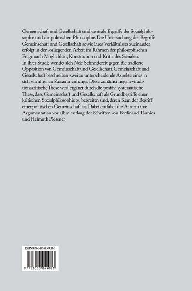Gemeinschaft und Gesellschaft sind zentrale Begriffe der Sozialphilosophie und der politischen Philosophie. Die Untersuchung der Begriffe Gemeinschaft und Gesellschaft sowie ihres Verhältnisses zueinander erfolgt in der vorliegenden Arbeit im Rahmen der philosophischen Frage nach Möglichkeit, Konstitution und Kritik des Sozialen. In ihrer Studie wendet sich Nele Schneidereit gegen die tradierte Opposition von Gemeinschaft und Gesellschaft. Gemeinschaft und Gesellschaft beschreiben zwei zu unterscheidende Aspekte eines in sich vermittelten Zusammenhangs. Diese zunächst negativ-traditionskritische These wird ergänzt durch die positiv-systematische These, dass Gemeinschaft und Gesellschaft als Grundbegriffe einer kritischen Sozialphilosophie zu begreifen sind, deren Kern der Begriff einer politischen Gemeinschaft ist. Dabei entfaltet die Autorin ihre Argumentation vor allem entlang der Schriften von Ferdinand Tönnies und Helmuth Plessner.